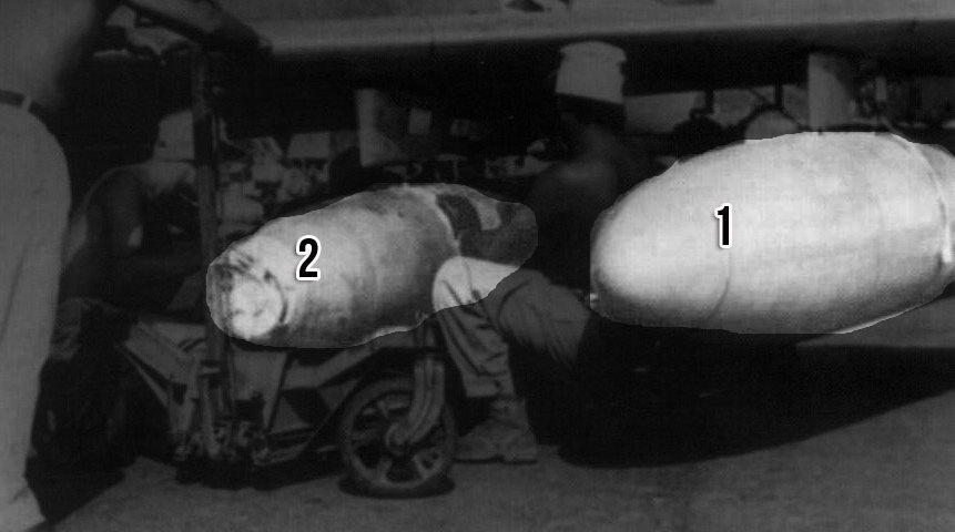 De realçar ainda que na legenda das fotos da página 70, o autor indica explicitamente "(...) os Aviões PV-2 (em cima) foram os bombardeiros utilizados pela Força Aérea no ataque à Baixa de Cassange. (...)" (sic). Curiosamente a única foto, na página precisamente ao lado, que acaba por ser evidenciada para supostamente demonstrar a carga de "napalm" do mesmo, recorre a um avião que nem sequer é um PV-2 (não sendo necessário qualquer nível de conhecimento técnico para os distinguir, dada, além da diferença geral de dimensões, a posição dos motores - num colocado nas asas e noutro no interior da fuselagem, e ainda a forma da cauda). Ainda assim, poderiam até as cargas a ser colocadas no avião da foto publicada corresponderem ao descrito pelo autor na legenda - mas também assim não é. Na posição exterior, marcada com o número "1" na foto recortada abaixo, está um tanque de combustível extra (tanques auxiliares amovíveis, ditos "drop tanks") de 200 galões (aproximadamente 760 litros). Na posição interior, marcada com o número "2", está um bomba convencional (ditas "general purpose"), de fragmentação/demolição (não de "napalm") - aparentemente de 500 a 750 libras (aproximadamente 227 a 340 quilogramas).